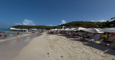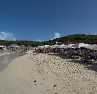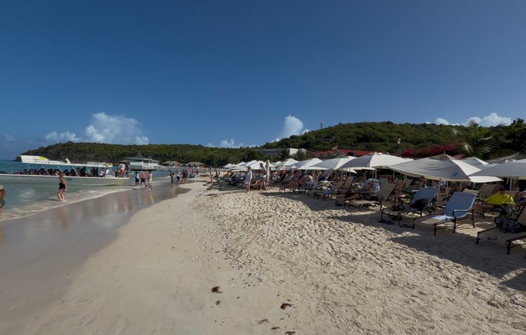 We chose Dickenson Bay, one of the most popular beaches on the island. It is an easy taxi ride for about $20 and a good option if you want a straightforward beach day with food, drinks, and water sports close by. Two beach chairs and an umbrella cost us $22, which felt reasonable for the location. The beach shares space with a Sandals resort, so the beach is well maintained and water is calm. Jet ski rentals and kayaks are readily available. The one drawback is crowds. Dickenson Bay fills up quickly, and arriving early is essential. Beach chairs do sell out, and the later you arrive, the busier and noisier it becomes. The beach chairs are worn down and not all of them are in great shape.
